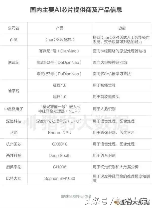 设备端推理:高通(移动端)、深鉴科技(机器人)、寒武纪科技(移动端、CV、机器人)、地平线科技(CV、机器人、语音)、FaceOS(CV)、思必驰(语音)、声智科技(语音)、云知声(语音)、启英泰伦(语音)、耐能(IoT)、NovuMind(IoT)、微软(VR)、华捷艾米(VR)、IBM(类脑芯片)、西井科技(类脑芯片)