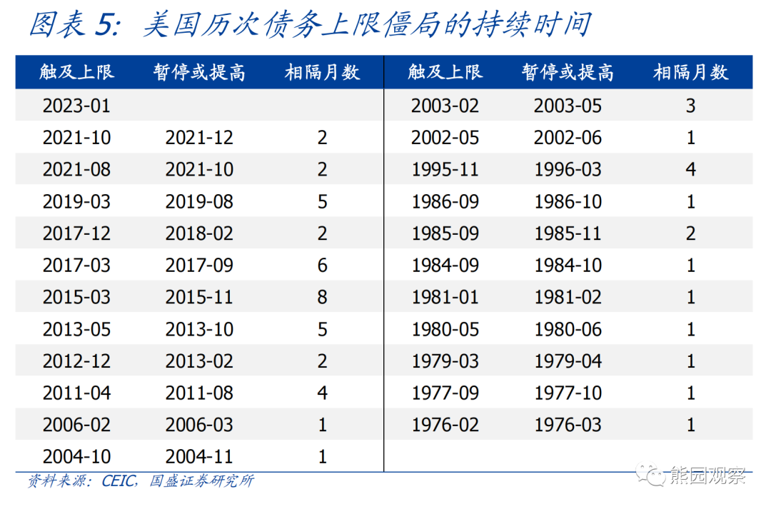 除本次外,1976年以来美国政府债务共有22次触及法定上限,每次债务上限触及后均得到了上调或暂停,只是经历的时间长短不同。1990年之前,债务上限触及后往往会立刻上调;但1990之后,债务上限僵局的持续时间明显延长,2010年之后则更加显著,这也从侧面反映了美国党争日益激烈化。2010年后的9次债务上限僵局,最短持续2个月,最长持续8个月,平均持续4个月,本轮到目前为止已持续了4个月。