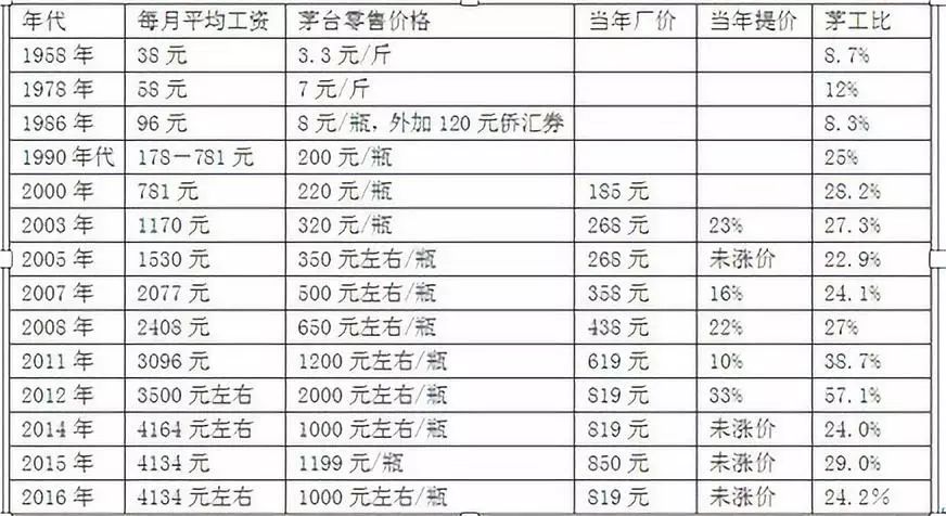根据北京圣雄品牌策划独家发现的飞天茅台价格的公式——茅工比测算发现,飞天茅台的涨价破百元价位在1987年128元,破三百价位在2003年320元、破五百2007年、破千元2011年、破两千2012年。飞天茅台的价格异常期间主要是在2011及2012年两年期间,这也是中国白酒行业最疯狂的两年,也就是四万亿刺激下的造成的异常,其它时间的茅台价格控制一直比较稳定,飞天茅台及平均工资比稳定在24-29%之间。