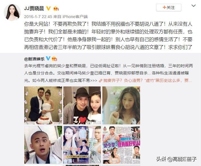 樊少皇护女友心切,急忙发表声明回应,称自己的确有过一段感情并育有子女,但早就因为感情、生活不合而在2007年分手,两人并没有结婚,所以贾晓晨并不是第三者。最终樊少皇与妻子陈少霞离婚,并把大部分财产都给了女方。