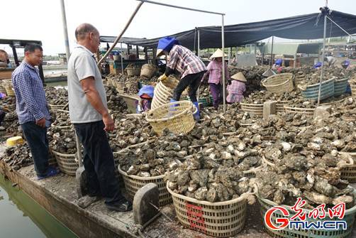 在红光村码头,村民正在对养殖的生蚝进行拆分。张薇 摄