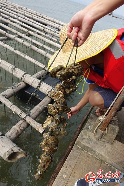 谢书记告诉,这里最美味的品种当属“近江牡蛎”,一般需要3年时间养成,大的有一个巴掌大小,一只大概半斤重,最大可达七八两重。随同出海渔船前往海湾内的养蚝基地,只见海上蚝田万亩,颇为壮观。蚝民们只需驾一条船,就能像收割葡萄一样,从棚架上扯上一条条挂满生蚝的胶绳。现场体验了一下,分量挺沉。