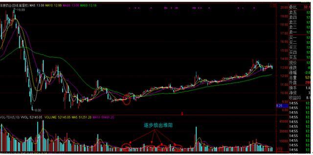 阳线开始逐步增多,阴线开始减小;同时成交量也是连续放出堆阳,堆阴开始减少;