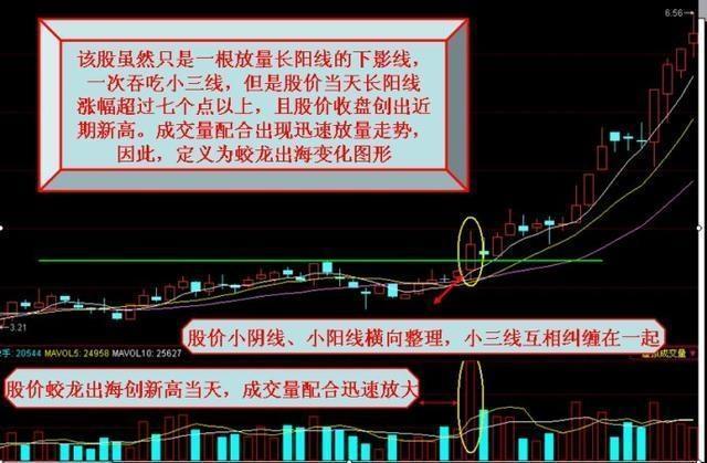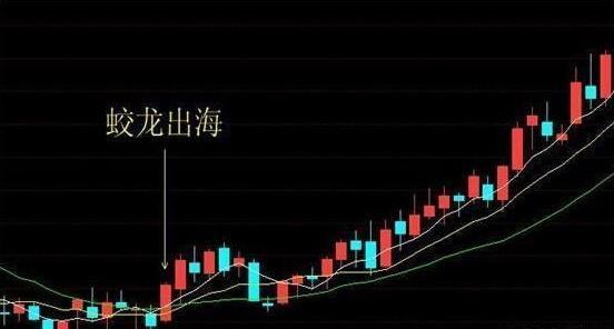 他是小三线和一根5个点以上的长阳线组合而成,当股价横向整理的末端,如果出现一根成交量突然放大,并且收盘价超过5个点以上的实体大阳线,且股价收盘创出近期新高,此种均线与K线组合而成的技术图形,叫做蛟龙出海。简单来讲就是小阴小阴之后出现一根放量大阳线突破前期比较重要的平台那么后期股价有望继续出现爆发。