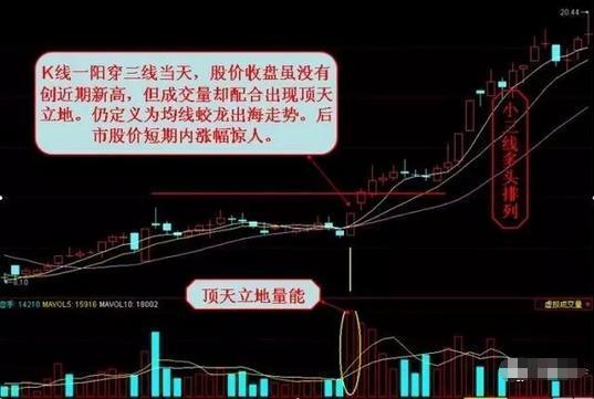 1.K线一阳穿三线当天,股价收盘虽没有创近期新高,但成交量却放出了近期天量,后市短期内股价涨幅惊人。