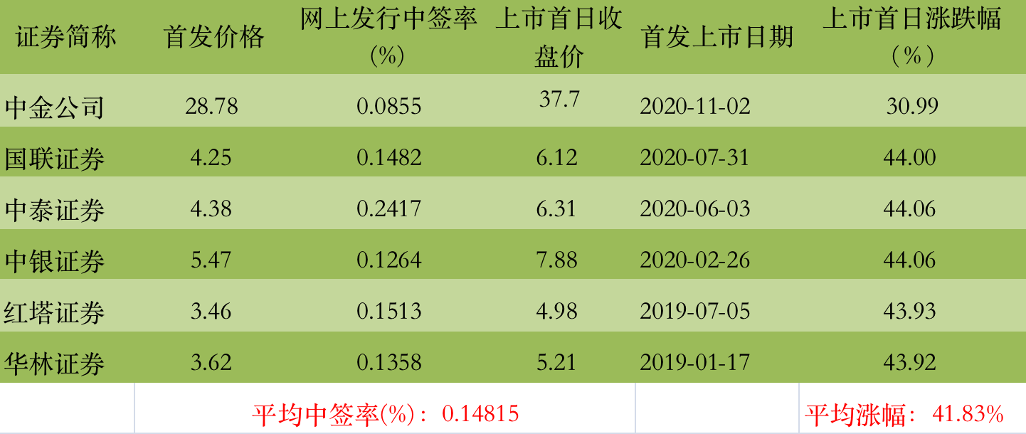 而最难打的券商股,则是去年回A上市的中金公司,网上发行中签率仅为0.0855%。