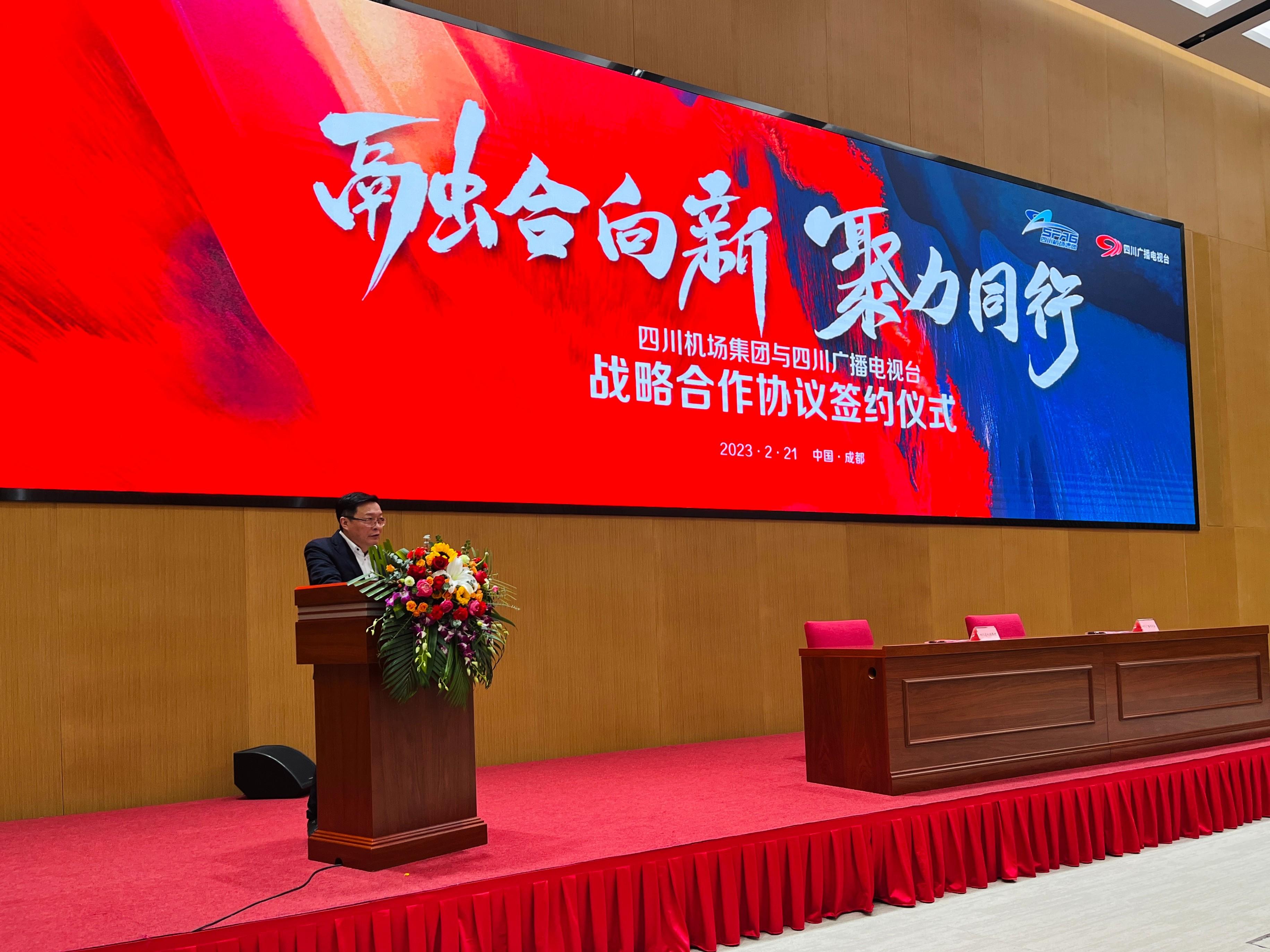 四川广播电视台党委书记、台长刘成安表示,四川广播电视台作为我省最重要的主流媒体之一,已成为拥有广播、电视、报纸、杂志、网络、新媒体、发射传输等全套传播手段,覆盖人口超11亿的新型主流媒体。其中,四川卫视作为四川第一外宣平台,“花开天下”跨年演唱会、川渝春晚等优质IP陆续出圈,在传播四川声音、讲好四川故事上发挥着不可替代的作用;“四川观察”全媒体矩阵粉丝量超过一亿,是全国主流媒体第一阵营中当仁不让的排头兵;四川IPTV集成播控平台用户总数超2700万户,位居全国第一;“四川名片”开创合作营销新模式,参与企业资产总规模超万亿,强力推动四川品牌踏上拥抱全国、迈向世界的新阶段。未来,川台将借助四川机场集团优质的交通枢纽资源,朝着“西部综合实力最强、全国一流的新型主流媒体”目标不懈努力。