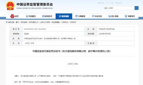 2020年9月,证监会公布了对东方金钰的行政处罚决定,由于虚增营业收入5.57亿元、虚增利润3.59亿元等财务造假,东方金钰被采取60万元的顶格处罚,时任董事长赵宁等19名责任人被给予警告及罚款,赵宁等4人被市场禁入。