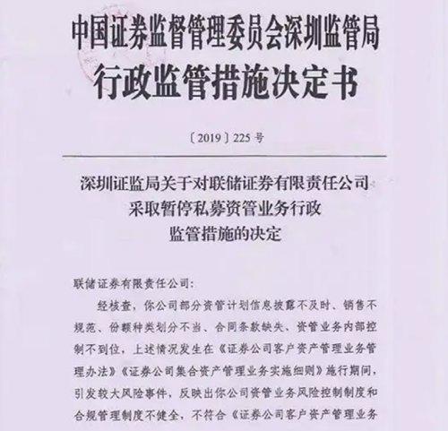 2019年12月,深圳证监局对联储证券做出暂停私募资管业务行政监管措施的决定,并指出其存在部分资管计划信息披露不及时,销售不规范,份额种类划分不当,合同条款缺失、资管业务内部控制不到位5大问题,引发较大风险事件。