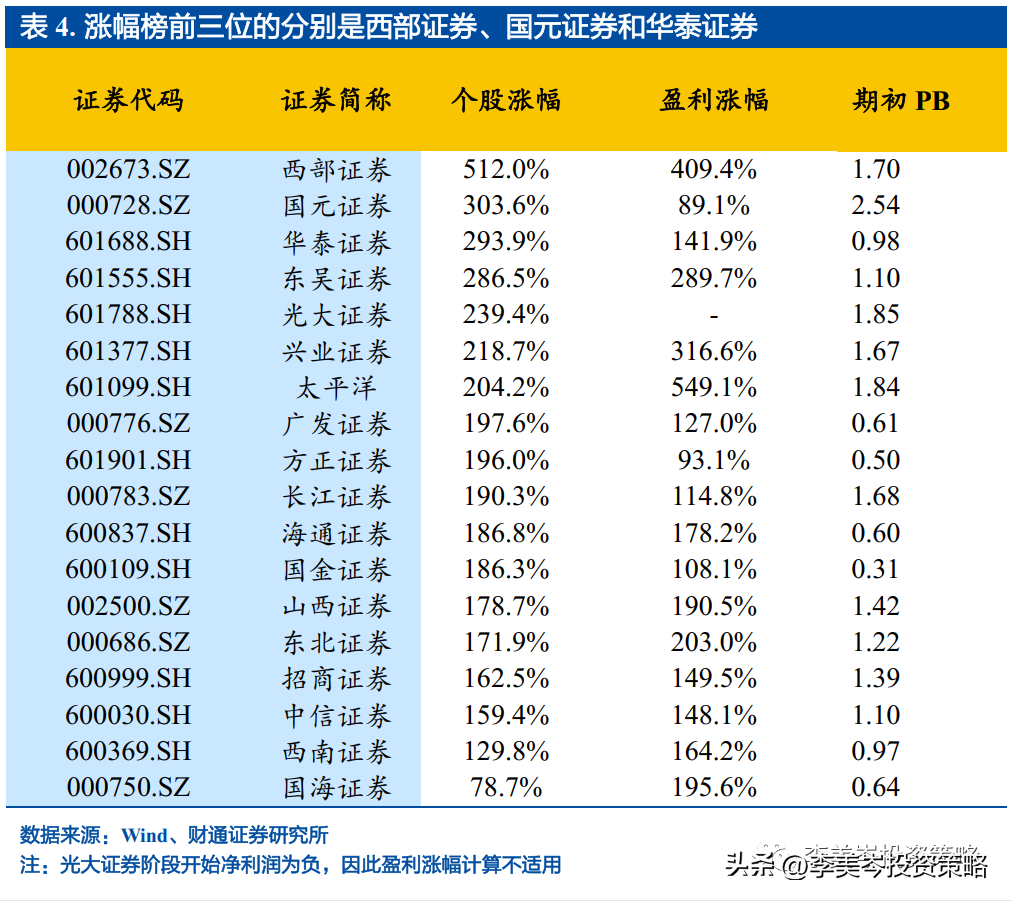 从具体个股的涨幅来看,位列涨幅榜前三位的分别是西部证券、国元证券、华泰证券,其涨幅分别是512.0%、303.6%和293.9%。盈利改善前三分别是太平洋(+)549.1%)、西部证券(+409.4%)和兴业证券(+316.6%)。