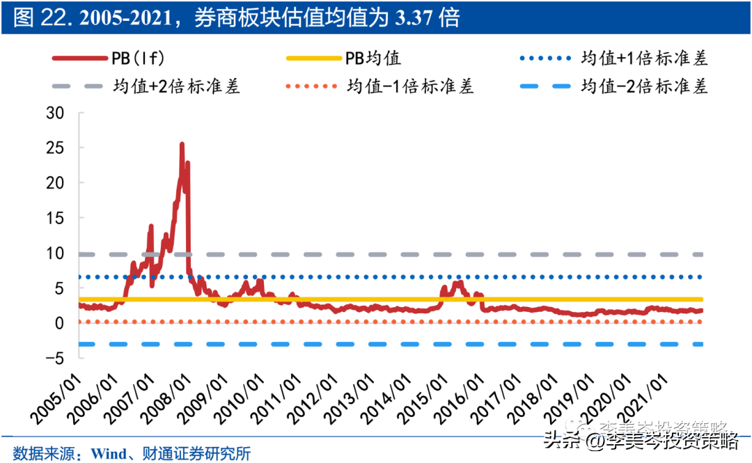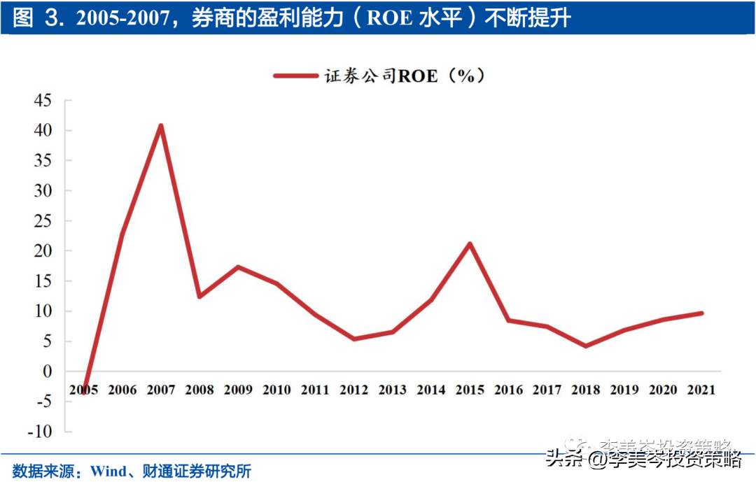 证券公司2005年ROE水平为-3.6%,随着经纪业务不断提升,2007年行业平均ROE提升至历史最高水平的41%,同期行业PB估值高达25倍。