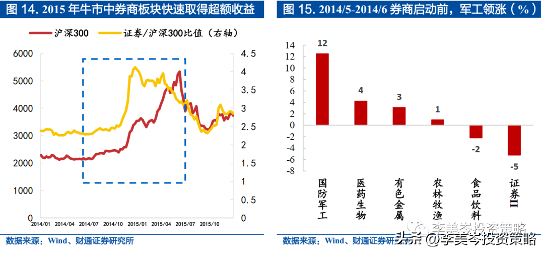 本轮行情开始于2014年7月份,初始上涨的行业是国防军工、机械设备等,券商板块跟涨,