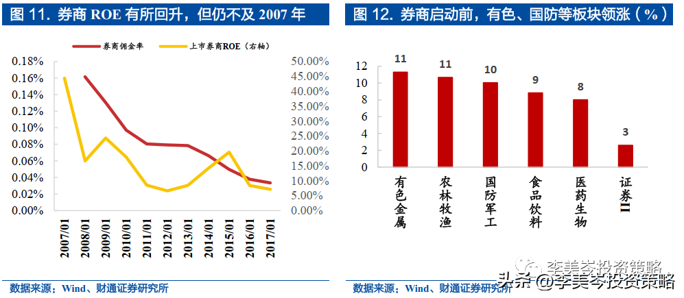 在此阶段,券商的佣金率持续下降,从万分之十六降至万分之十三。和上一轮行情类似,券商板块在其他有色、国防军工等板块上涨后涨幅跟进。2008年10-11月有色、国防等板块领涨。
