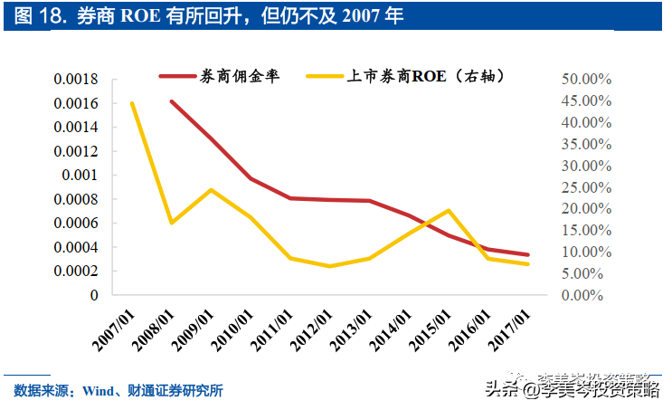 券商ROE于2007年达到历史最高点,后续持续降低。