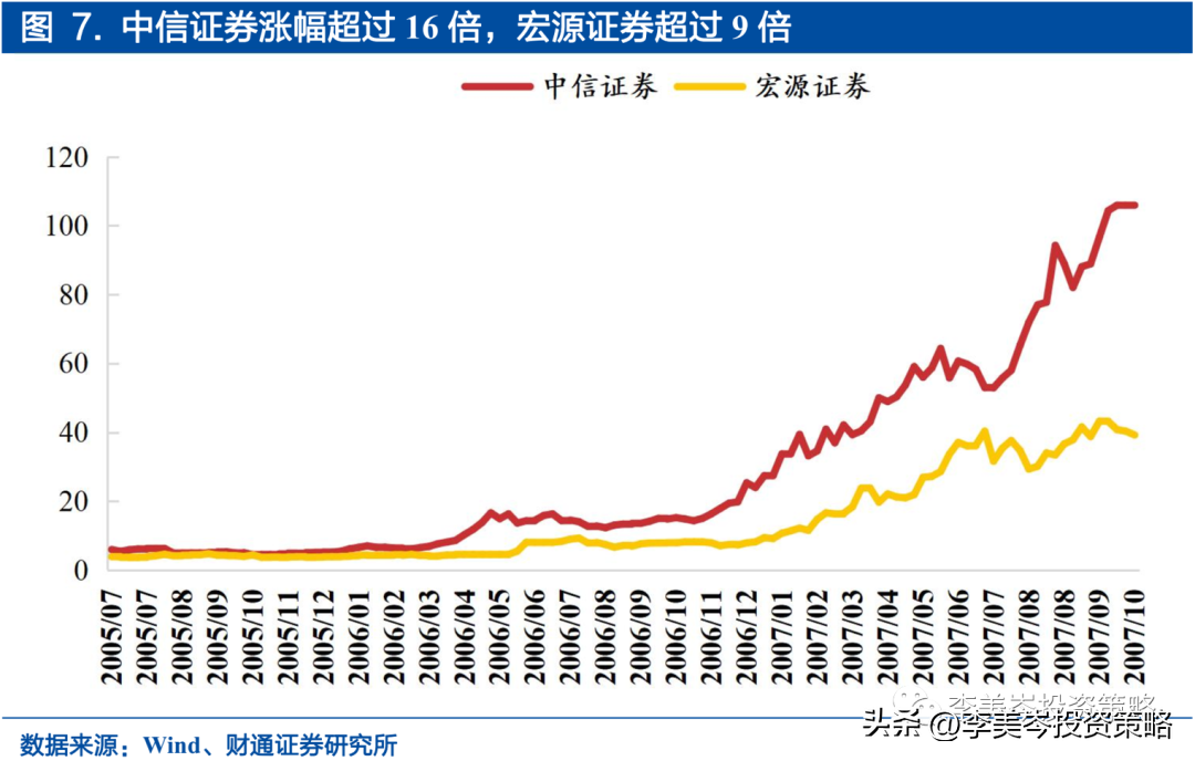 2005-2007完整阶段,上市券商仅宏源证券(后于2015年1月26日退市)和中信证券。从具体个股的涨幅来看,中信证券涨幅超过16倍,宏源证券超过9倍。国元证券和长江证券分别于2007年7月3日和2007年9月28日借壳上市,由于借壳上市往往股价大幅上涨,在此国元证券和长江证券股价涨幅不做比较。