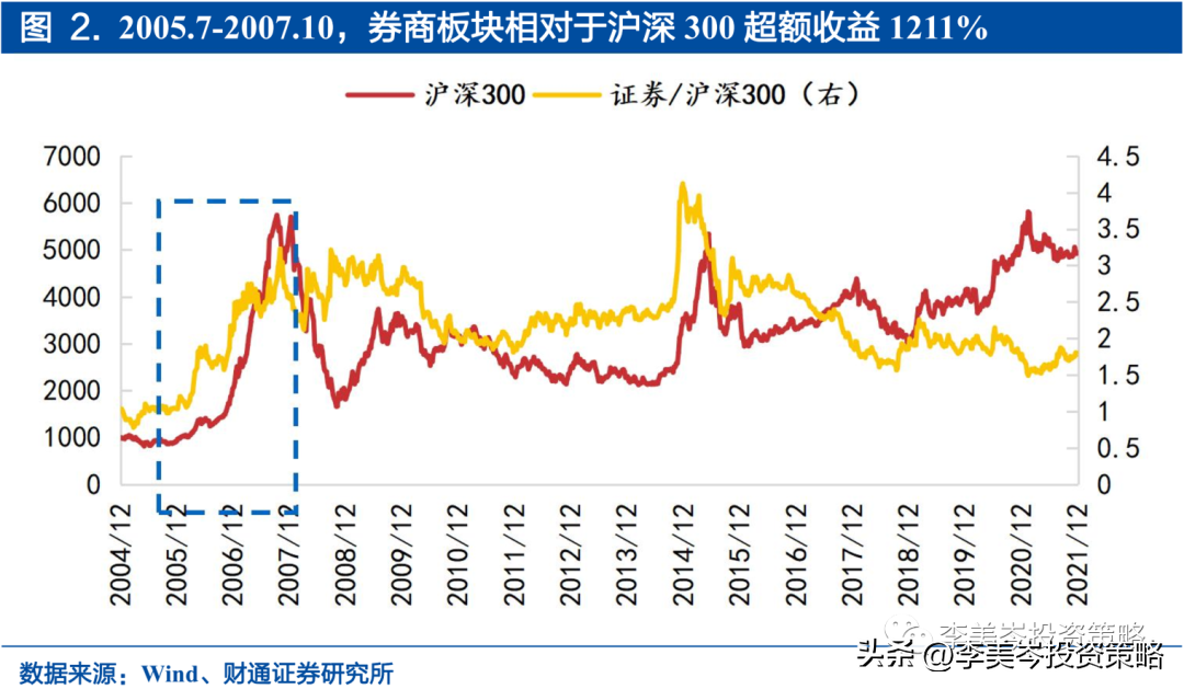 自2005年7月至2007年10月,持续时间456天,券商板块涨幅为1738%,同期沪深300指数涨幅为527% ,相对沪深300指数的超额收益为1211%。