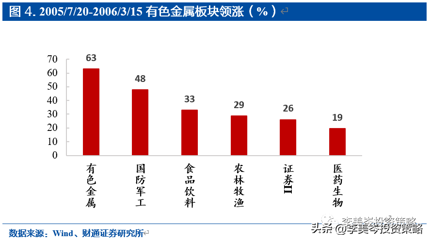 此轮行业至2006年3月,有色金属板块领涨,券商跟涨。