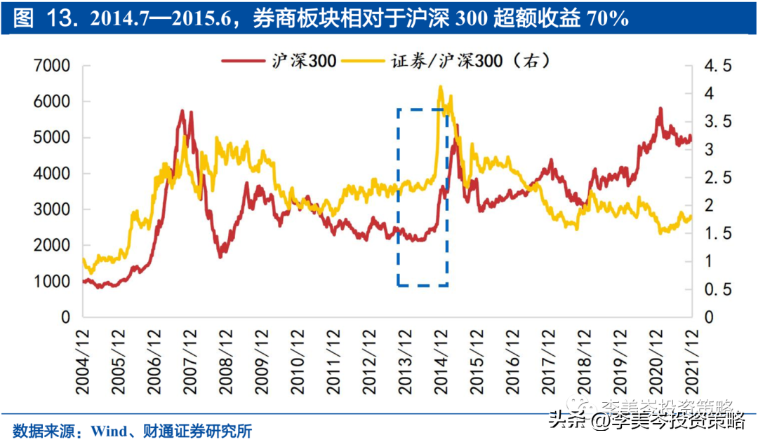 自2014年7月至2015年6月,持续时间一整年,券商板块涨幅为169%,同期沪深300指数涨幅为99% , 相对沪深300指数的超额收益为70%。