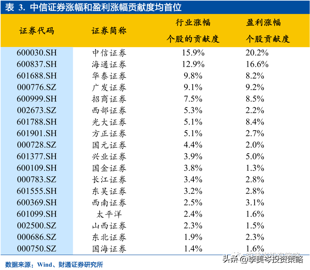 其贡献度分别为15.9%、12.9%和9.8%。其中由盈利涨幅达到171.8%,个股贡献度前三位分别是中信证券、海通证券、广发证券,其贡献度分别是20.2%、16.6%和9.2%)。