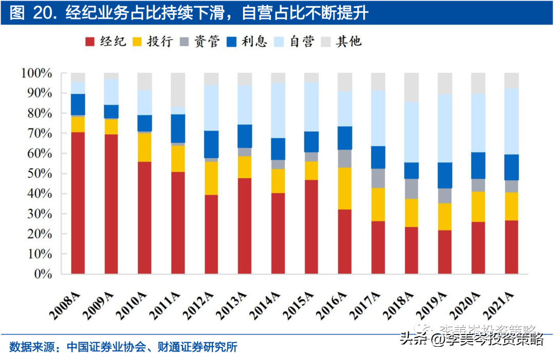 重资产收入占比自2012年以来持续提升。券商业务结构的变化,导致行业ROE和PB估值中枢下行。