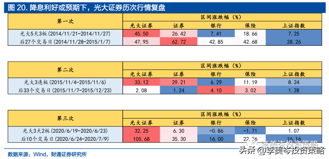 2020年6月17日,国常会要求实际融资成本明显下降,加之次日央行下调14天逆回购利率20BP,市场形成降息预期,带动情绪提升。光大证券自6月19日起的3个交易日内上涨32.3%,带动新一轮行情。后续10个交易日内,光大证券继续大幅上涨105.7%,证券行业上涨35.3%,上证指数在此期间涨幅达16.2%。