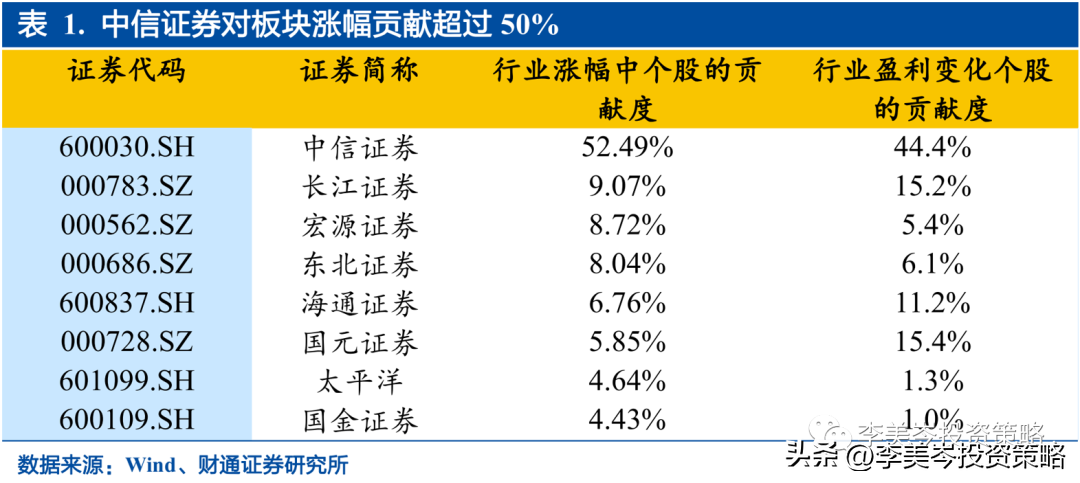 中信证券、海通证券、广发证券、华泰证券和招商证券市值占比高达56%,涨幅贡献合计为55.2%,其中盈利贡献合计62.7%。