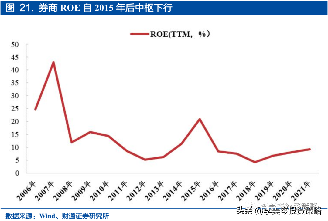 自2015年后,ROE中枢持续下行,由2015年的21%下行至2021年的9%左右。