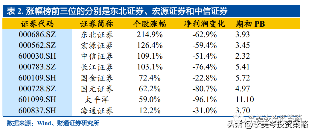 涨幅前三位的个股分别是东北证券(+214.9%)、宏源证券(+126.4%)和中信证券(+109.1%),本轮超额收益行情中,东北证券和宏源证券涨幅均超过行业龙头中信证券。