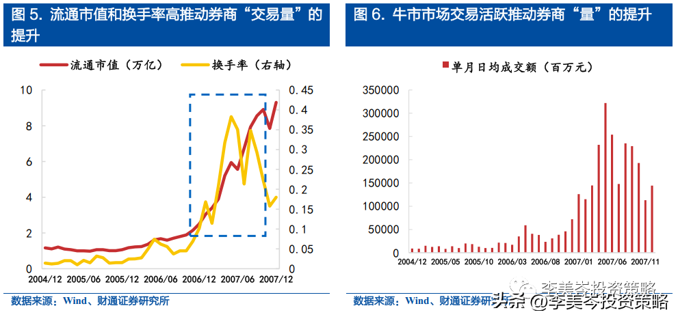 2005-2007年牛市阶段,一方面市场风险偏好提高,全行业估值普遍上升,另一方面牛市中较高的成交量、换手率等,叠加这一时期千分之二左右的平均佣金率,对券商经纪业务、投行业务等盈利都是利好。