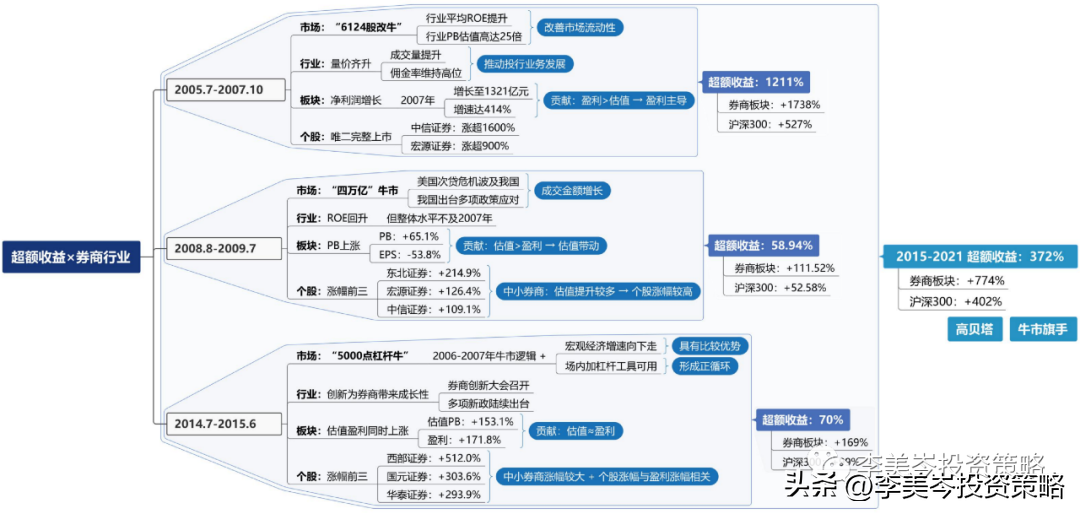 三轮超额收益行情均发生在“牛市”行情,券商板块呈现高贝塔特点,典型的牛市旗手。