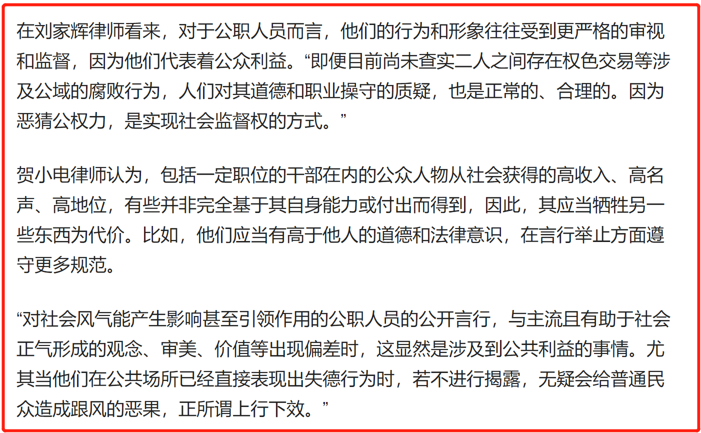 在刘家辉律师看来,对于公职人员而言,他们的行为和形象往往受到更严格的审视和监督,因为他们代表着公众利益。