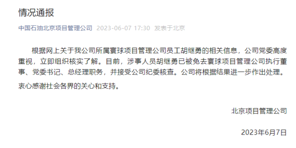 据悉,“街拍门”男主叫胡继勇,是中石油寰球工程项目管理的执行董事。
