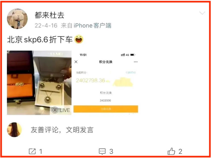 要知道240万的积分,意味着她在SKP消费了240万以上,足见她的“壕气”。