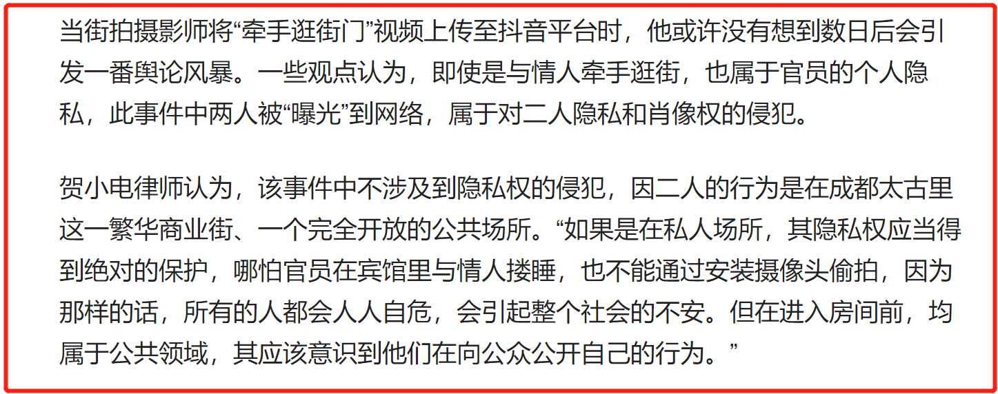 贺小电律师认为,该事件中不涉及到隐私权的侵犯,因二人的行为是在成都太古里这一繁华商业街、一个完全开放的公共场所。