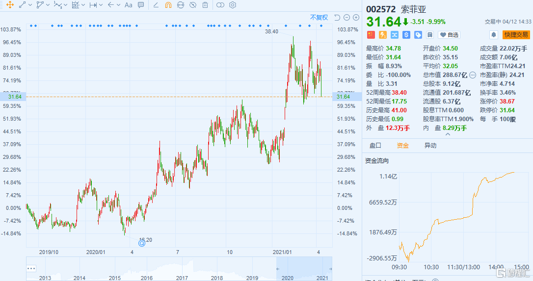 昨晚发布财报后,定制家具龙头索菲亚今日低开低走后随即跌停。截至发稿,股价现报31.64元,成交额逾7亿元,最新总市值288.7亿元。