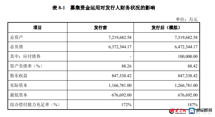 根据2022年7月18日发布的《利安人寿保险股份有限公司2022年资本补充债券(第一期)募集说明书》显示:以 2021 年 12 月 31 日发行人合并口径财务数据为基准,债券发行 10 亿元后,利安人寿综合偿付能力充足率将由发行前的 172%上升为发行后的 187%,上升 15 个百分点。