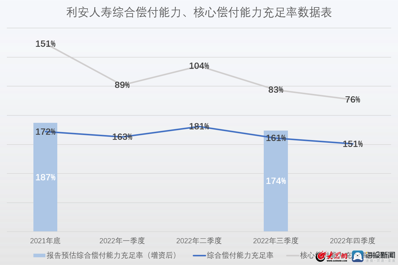 据利安人寿2022年三、四季度偿付能力季度报告显示,第三季度,该公司综合偿付能力充足率和核心偿付能力充足率分别为161.08%和83.12%,分别较年初下降11.34和68.30个百分点,均低于首期资本补充债发行之前。第四季度两项数据继续下降,分别达到151.32%和75.66%。