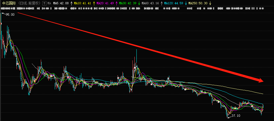 K线显示,中芯国际自A股上市首日(2020年7月16日)最高涨至95元后,便上演了“上市即巅峰”的剧情。此后在长达2年多时间里,该公司股价震荡走低,最低跌至37.1元。