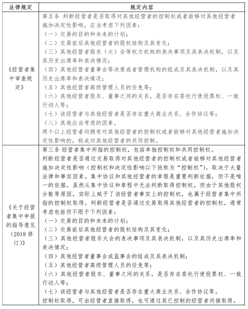 《经营者集中审查规定》(下称《审查规定》)、《关于经营者集中申报的指导意见(2018修订)》(下称《指导意见》)规定了经营者集中的控制权认定的参考因素。