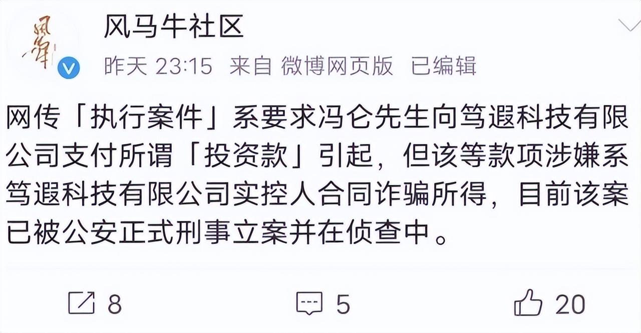 在被媒体报道成为“被执行人”的当晚,冯仑在微博上转发了一则风马牛社区发布的微博,表示“网传‘执行案件’系要求冯仑先生向笃遐科技有限公司支付所谓‘投资款’引起,但该等款项涉嫌系笃遐科技有限公司实控人合同诈骗所得,目前该案已被公安正式刑事立案并在侦查中”。