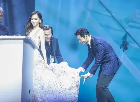 2019年,Baby一脸冷漠走在前头,黄晓明提着她的裙摆跟在后面,两人全程无交流。