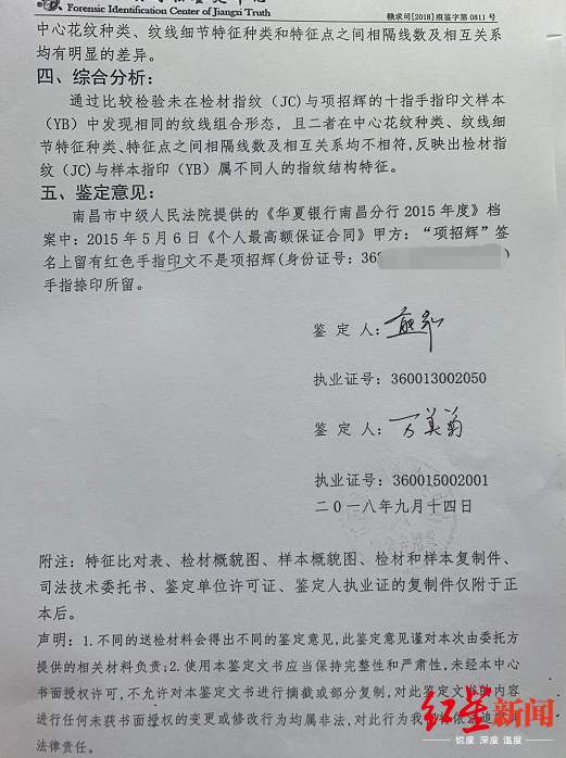 2018年9月,项招辉拿到了司法鉴定书,结果显示指纹和笔迹都不是他本人的。后来项招辉拿着鉴定书,将情况反映至江西银监局。