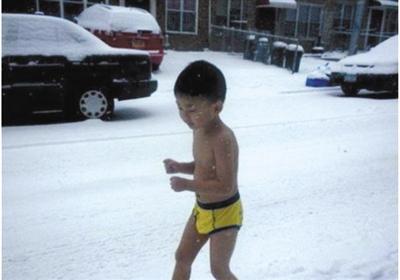 4岁时的何宜德被爸爸要求在雪地里裸跑,他也被称为“裸跑弟”。记者 卫潇雨