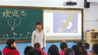 何宜德为小学三年级的孩子做分享,提及父亲对他的鹰式教育。记者 卫潇雨