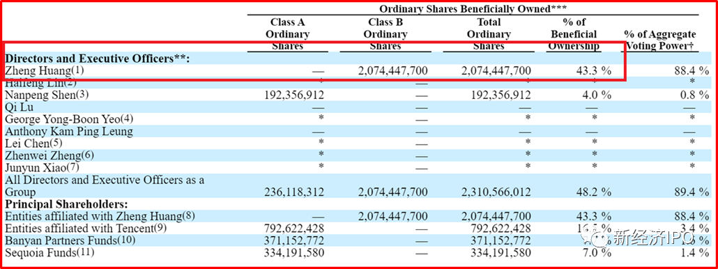 黄峥持有全部20.74亿股B类股,占总股本的43.3%。
