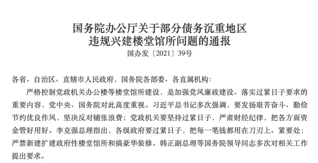 “严格控制党政机关办公楼等楼堂馆所建设,是加强党风廉政建设、落实过紧日子要求的重要内容,党中央、国务院对此高度重视。”10月27日,国务院办公厅发布了《关于部分债务沉重地区违规兴建楼堂馆所问题的通报》。