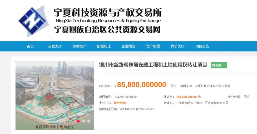 这里还有一个细节,就在被国务院通报之前,10月25日,澎湃新闻报道称,银川市丝路明珠塔在建工程和土地使用权转让项目通过协议转让,由宁夏本土房企宁夏中房实业集团有限公司以挂牌价8.58亿元,于10月13日成交。