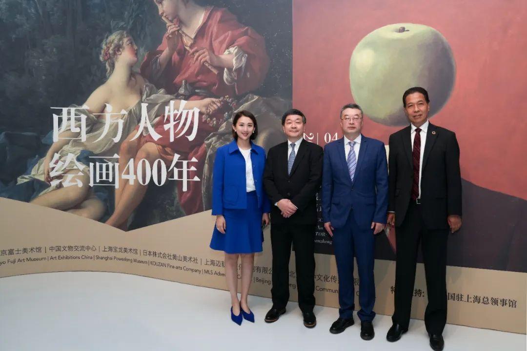 “西方人物绘画400年”展览现场,日本黄山美术社社长陈建中(右起)、中国文物交流中心主任谭平、东京富士美术馆馆长五木田 聪、宝龙集团执行董事许华琳