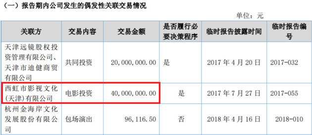 开心麻花2017年年报显示,公司在报告期内与西虹市影业发生“电影投资”关联交易,交易金额为4000万元。