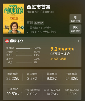 猫眼票房数据显示,截至8月9日14时,《西虹市首富》累计票房22.22亿元。